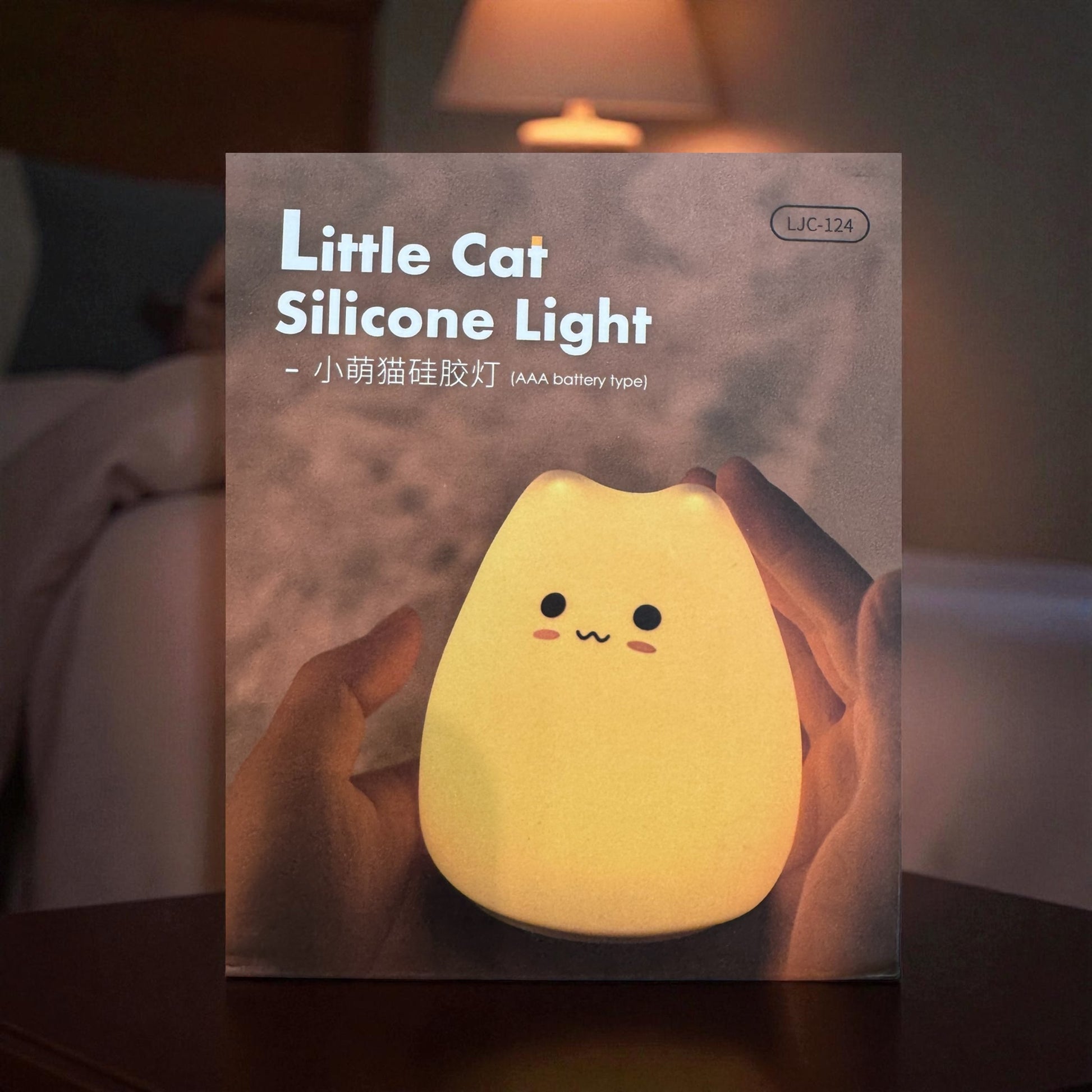 Luminária fofa em formato de gato. Design compacto, feita de silicone e alimentada por bateria. 9x10,5cm